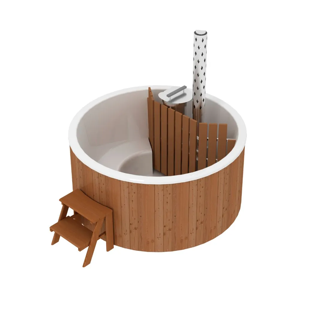 • Фурако круглая из кедра с литой термопластиковой вставкой с внешней печью Это уличная подогреваемая купель с круглой внутренней чашей из термопластика, которая имеет цельную форму вместе с сиденьями и дном. Для удобства пользования купель фурако оборудована приставной лестницей. Подогрев воды осуществляется за счет внешней печи с дымоходом. Термопластик устойчив к воздействию температур, облегчает уход за фурако и увеличивает срок ее службы. Парение на свежем воздухе – это отличный способ укрепить здоровье и поддержать организм в тонусе.