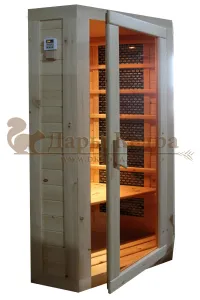 Это специально оборудованная кедровая кабина для прогрева тела человека сухим теплом. Воздух в таких парных не нагревается. Инфракрасные лучи воздействуют на тело, равномерно прогревая мышцы, суставы и органы. Карбоновые излучатели, встроенные в стены кабины, обладают мягким прогревом, что полностью исключает возможность ожога. Работает кабина за счет электричества. Установка сауны в угол, позволяет рационально использовать пространство помещения. Подходит как для домашнего использования, так и для коммерции.