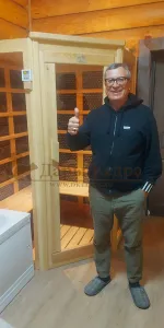 Это специально оборудованная кедровая кабина для прогрева тела человека сухим теплом. Воздух в таких парных не нагревается. Инфракрасные лучи воздействуют на тело, равномерно прогревая мышцы, суставы и органы. Карбоновые излучатели, встроенные в стены кабины, обладают мягким прогревом, что полностью исключает возможность ожога. Работает кабина за счет электричества. Установка сауны в угол, позволяет рационально использовать пространство помещения. Подходит как для домашнего использования, так и для коммерции.